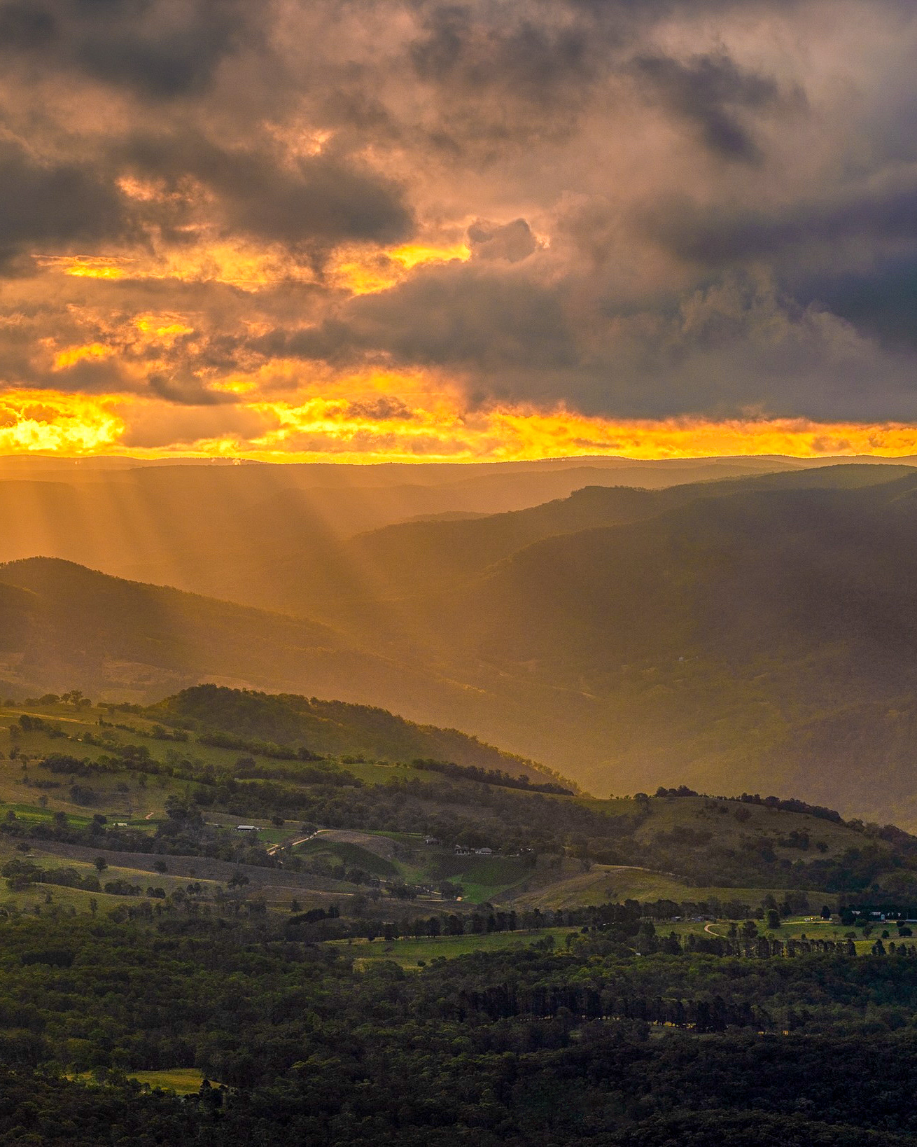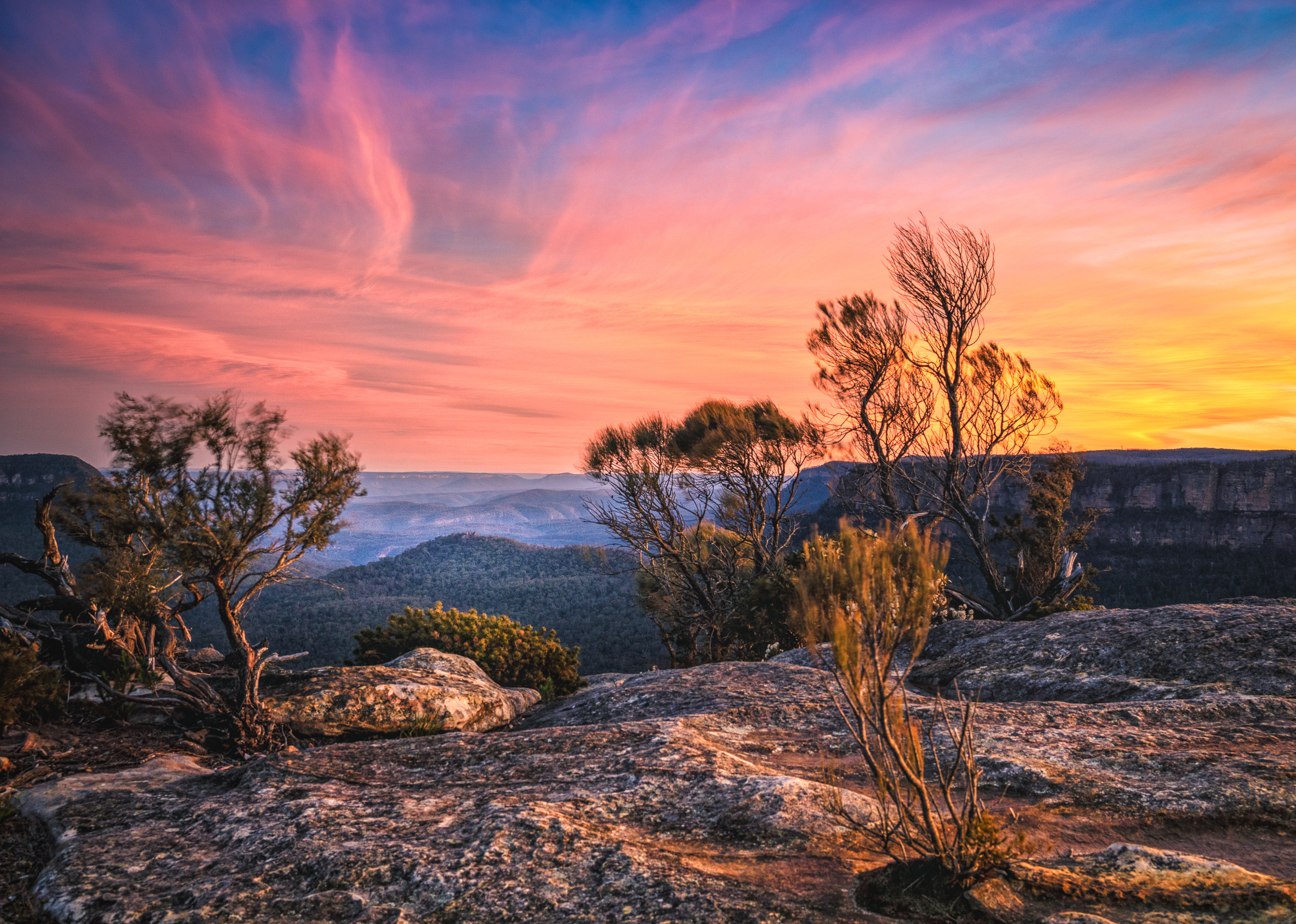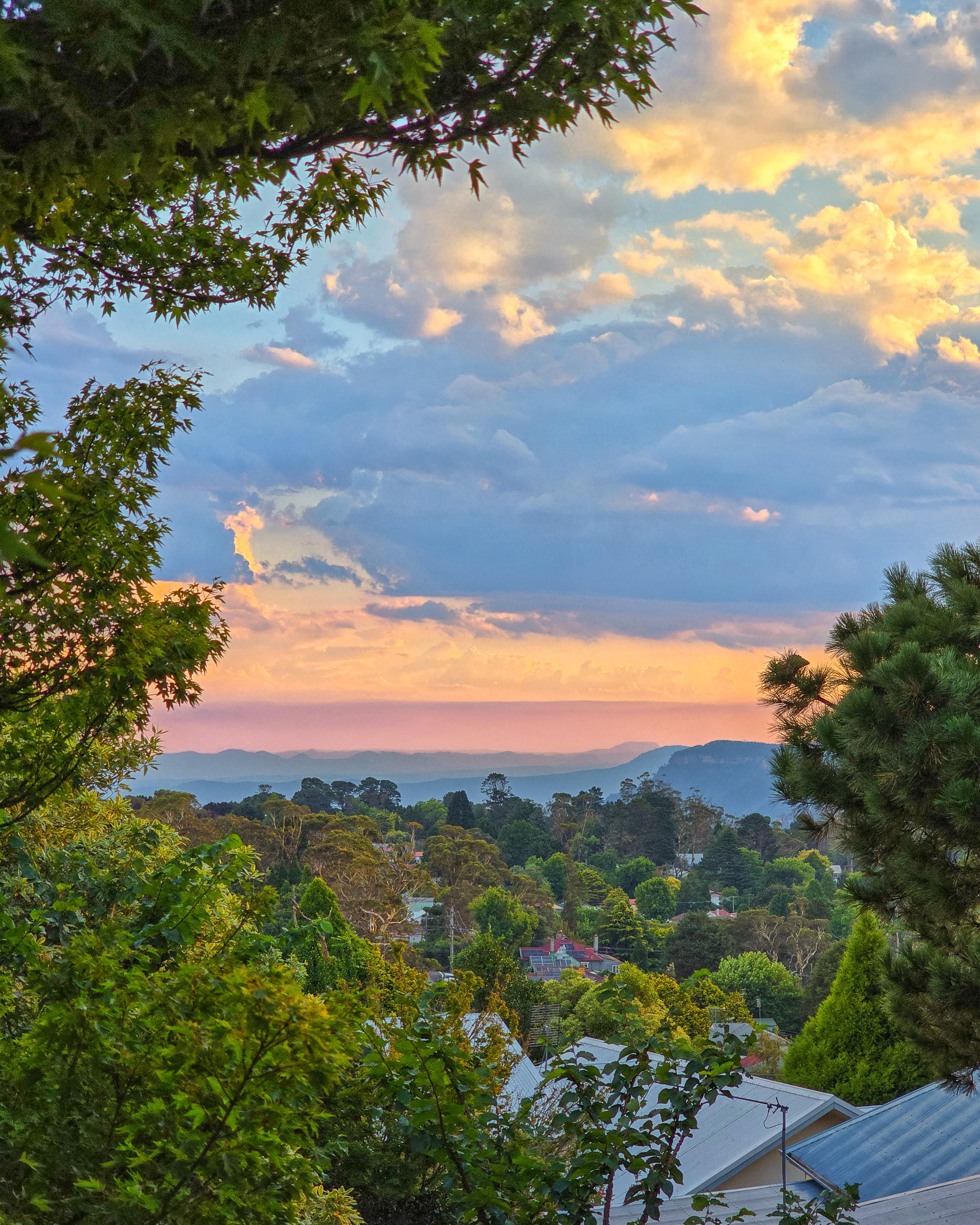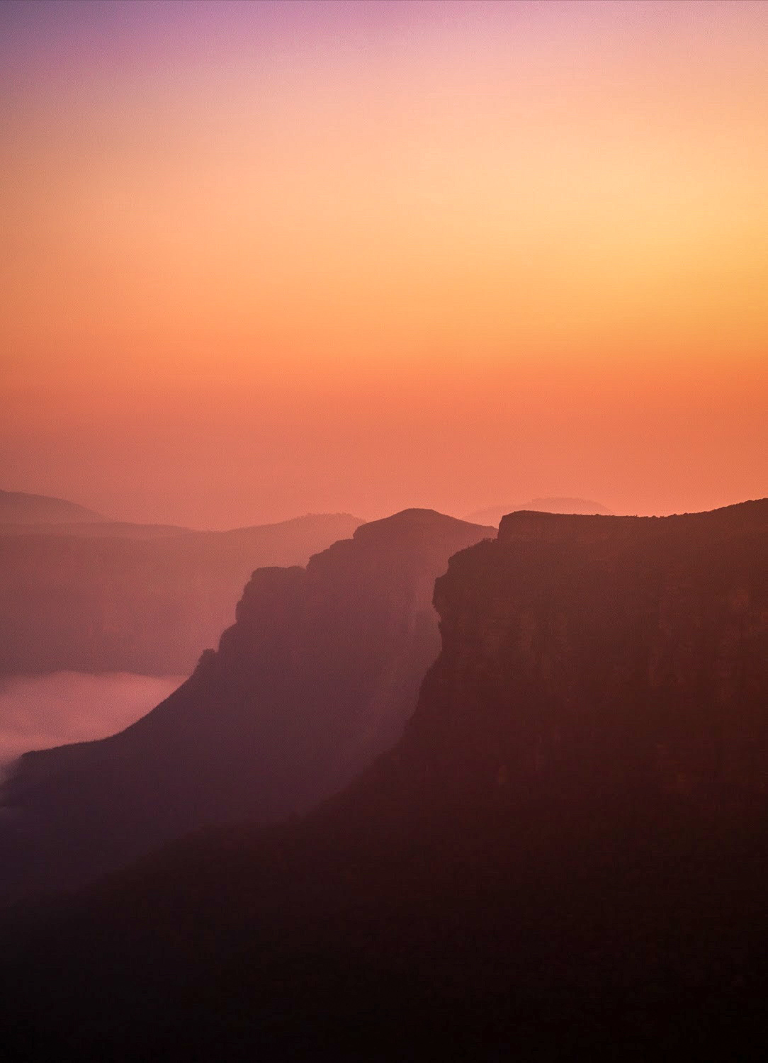 The Blue Mountains are always changing with the light, weather, and seasons. This series explores how colours shift across the escarpment, from gentle sunrise tones over the Jamison Valley to misty mornings and the dramatic light after a storm.