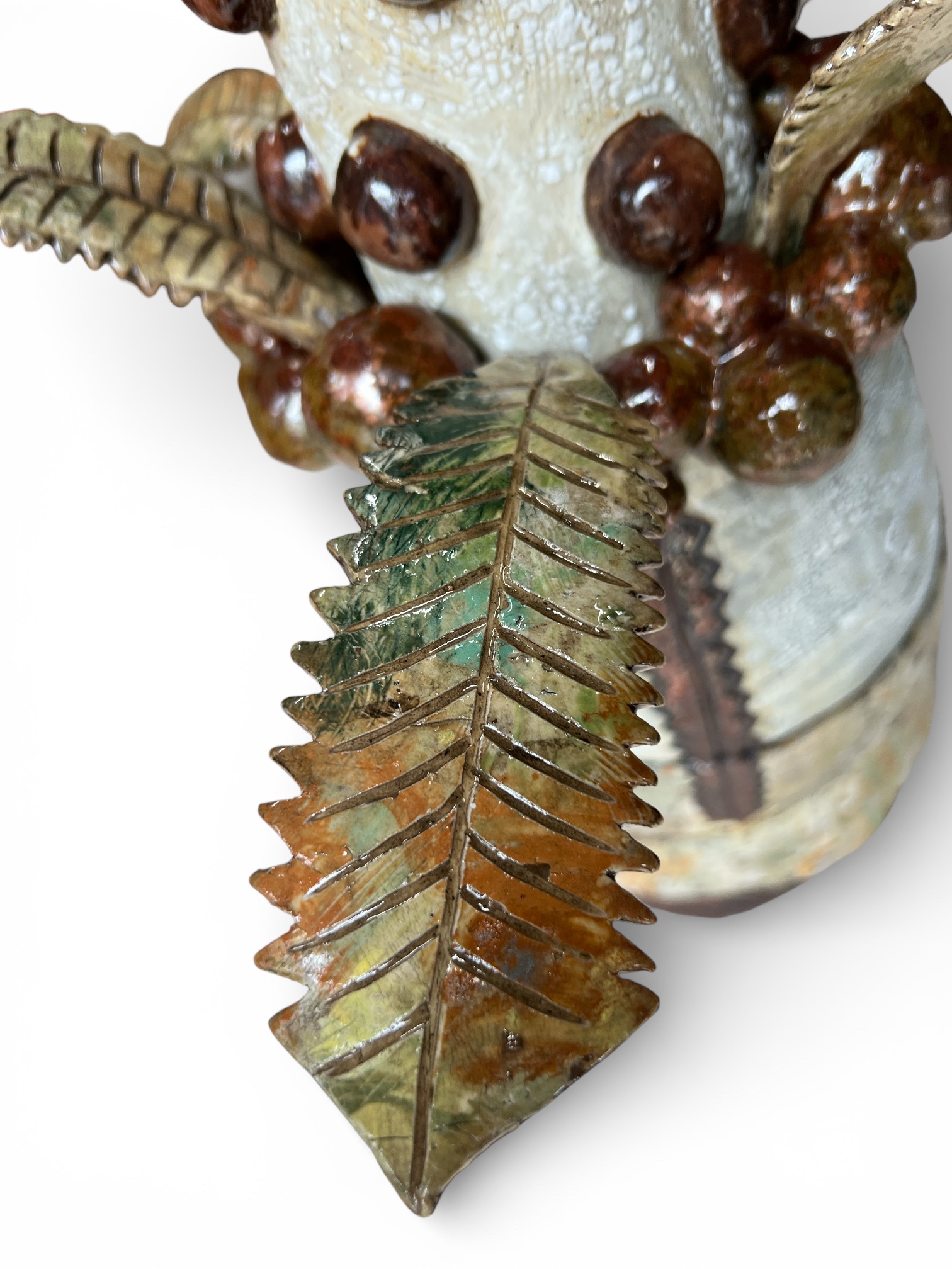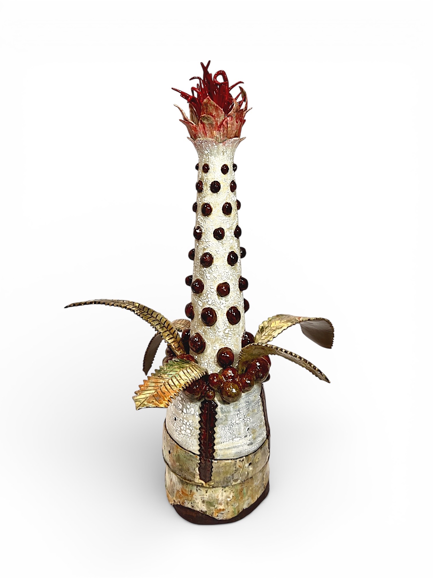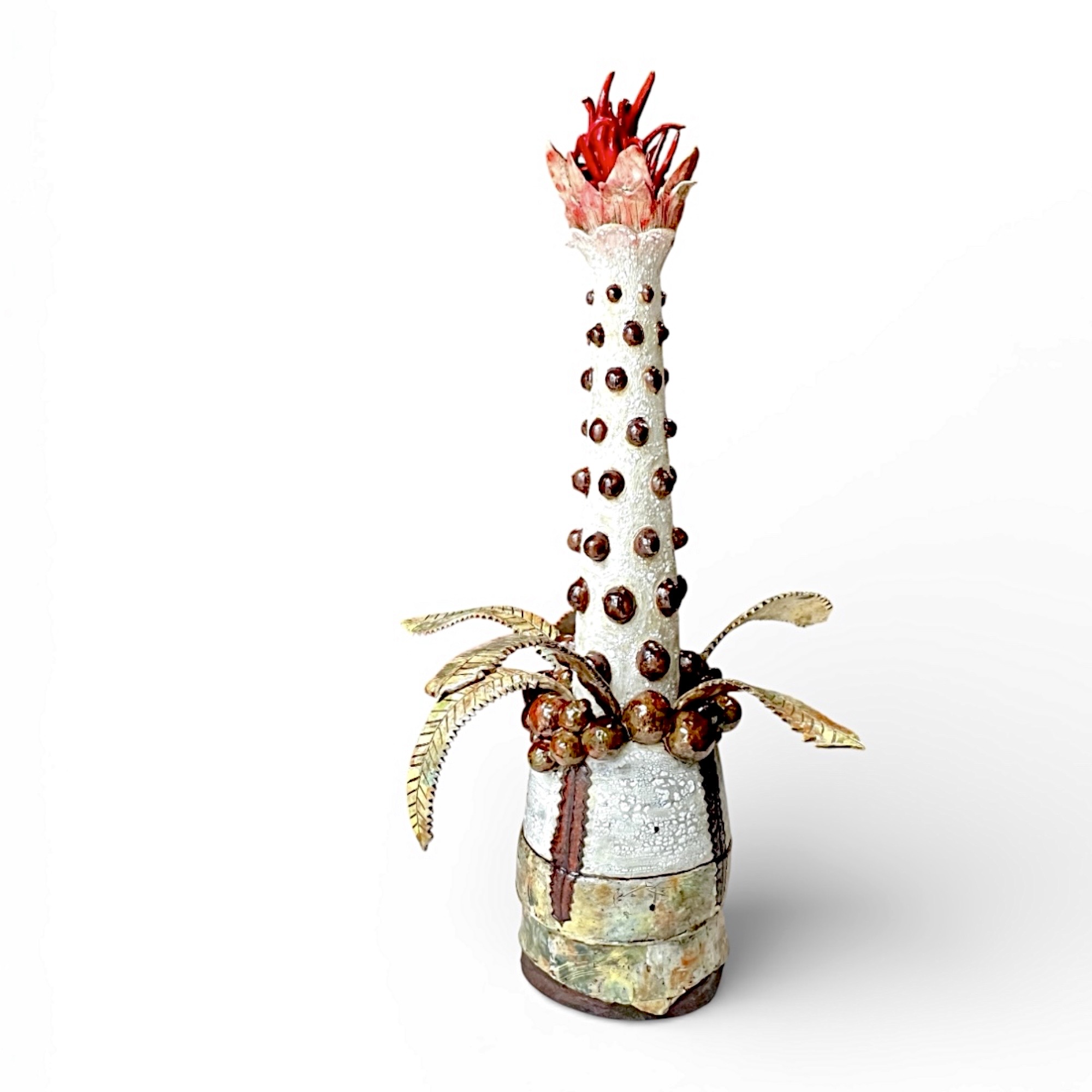 ‘Emergence’ draws reference from Australian native flora and is formed from locally foraged and blended clay bodies. The clay was sustainably collected from my property in Faulconbridge after unseasonable rain exposed natural deposits. The monolithic form stands resolute yet bleached, carrying traces of colour. It reflects the possibility of hybridisation as native species adapt in the dawn of climate change. Textured surfaces and eruptive growths evoke heat, regeneration, and fire-scarred ecologies, reimagining familiar forms as stylised hybrids shaped by rising temperatures.