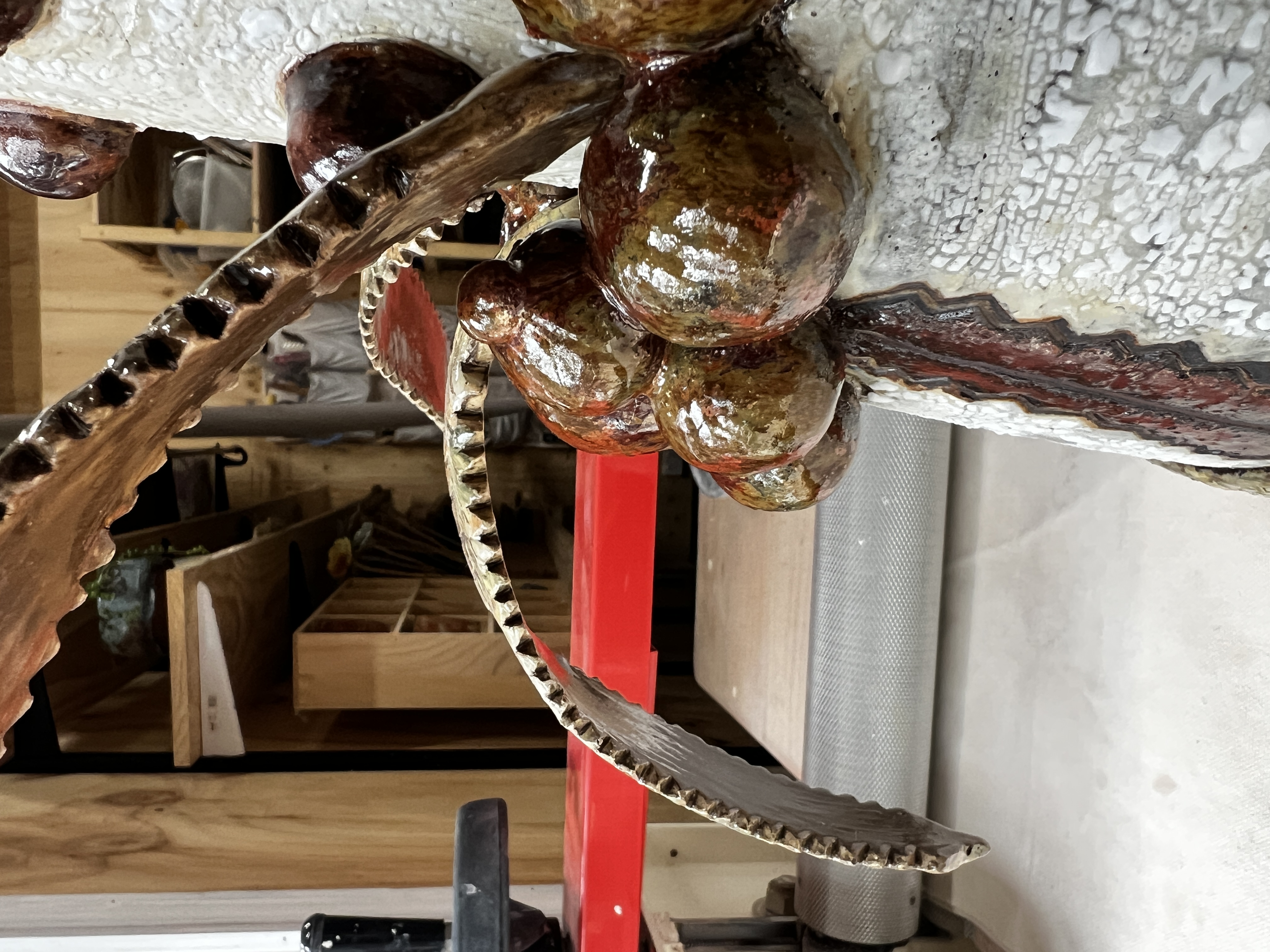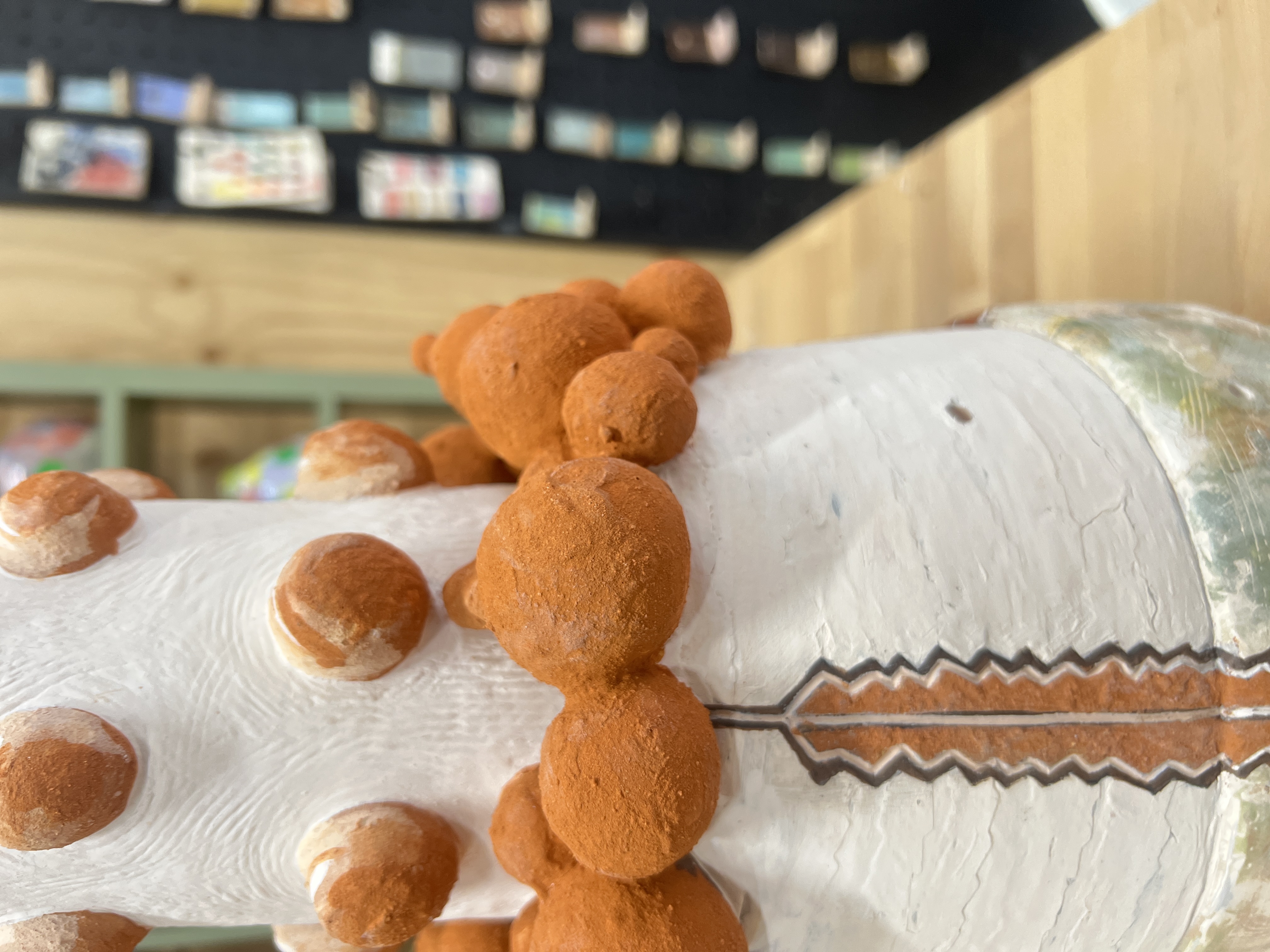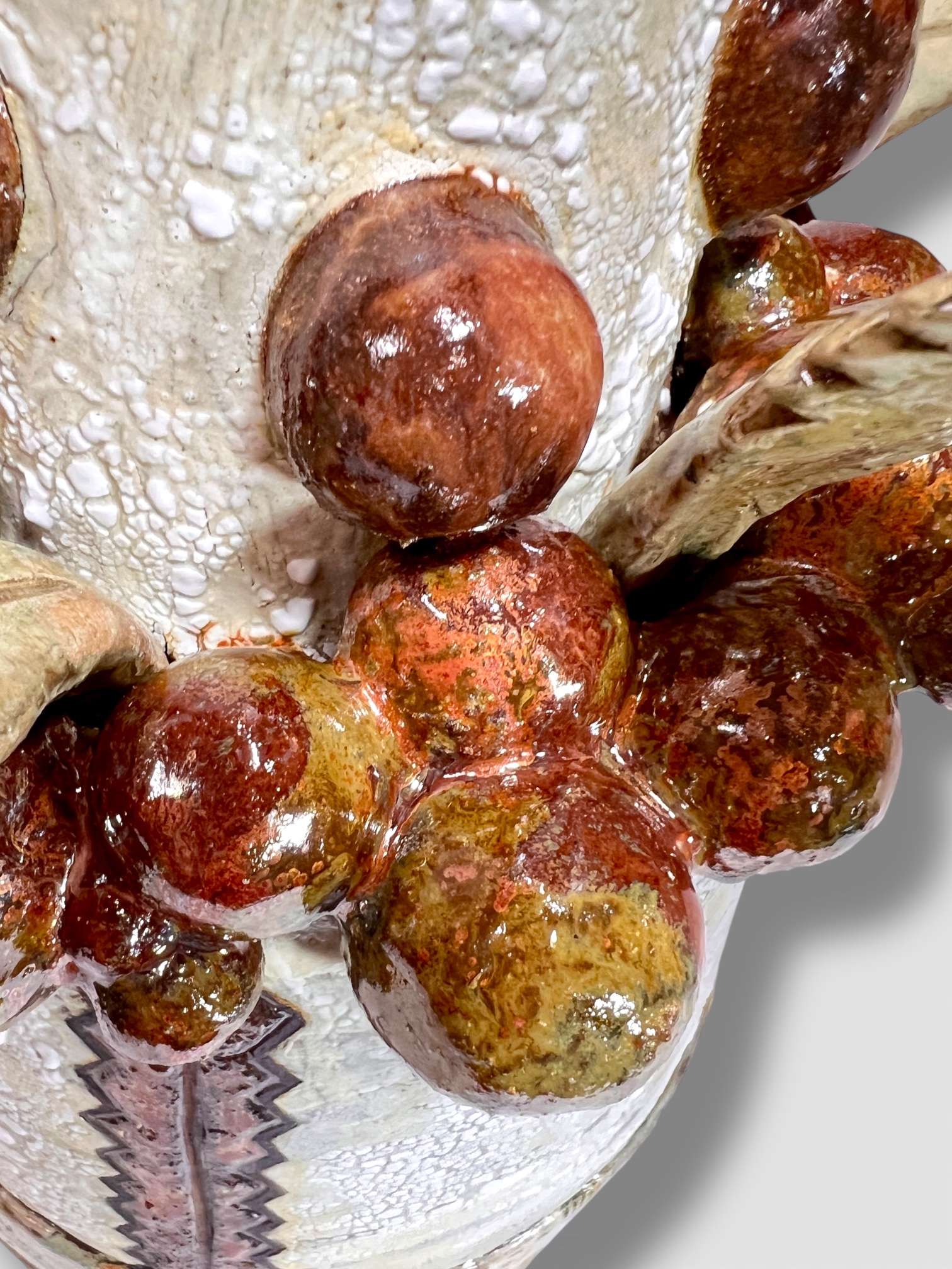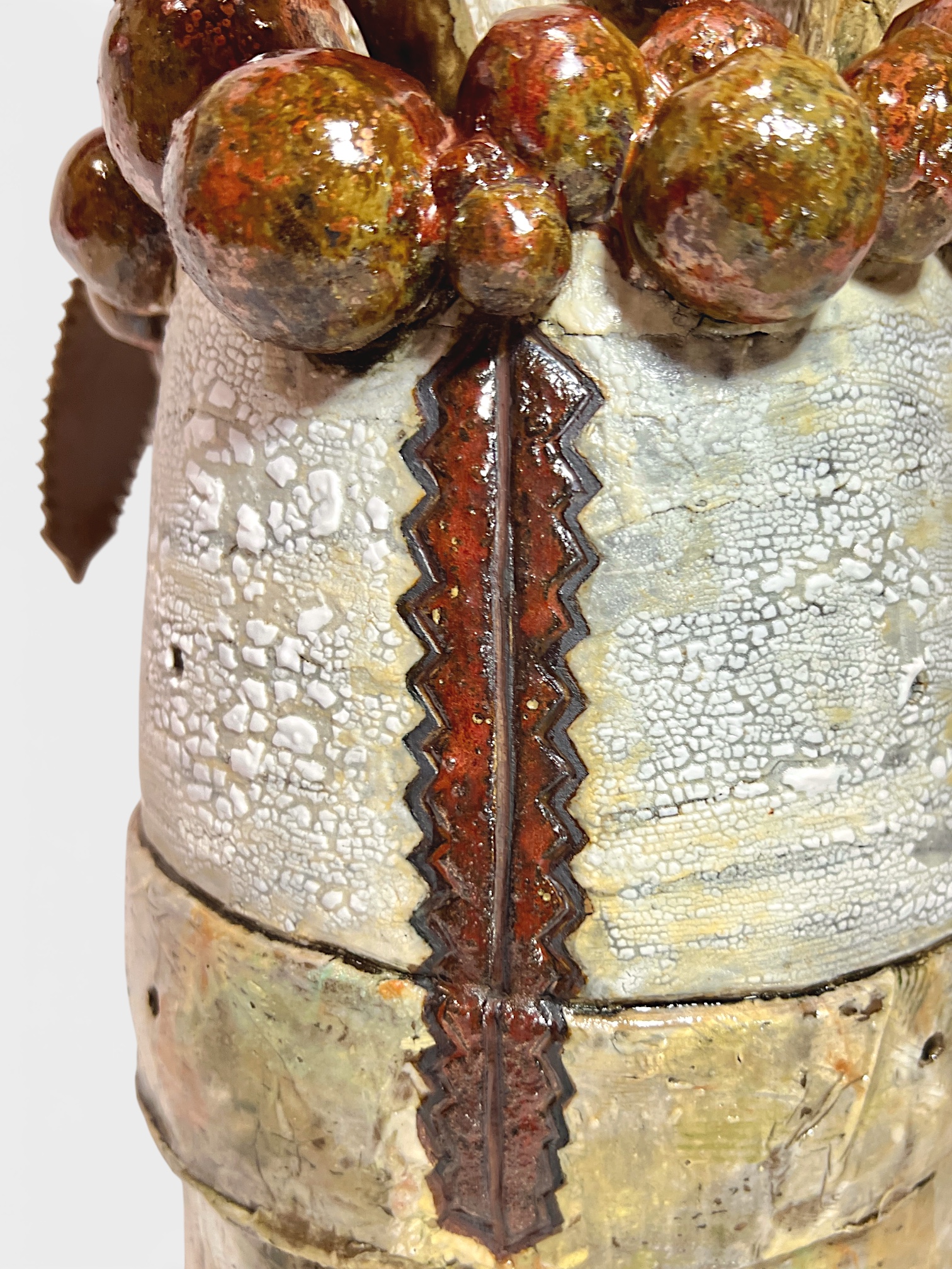 ‘Emergence’ draws reference from Australian native flora and is formed from locally foraged and blended clay bodies. The clay was sustainably collected from my property in Faulconbridge after unseasonable rain exposed natural deposits. The monolithic form stands resolute yet bleached, carrying traces of colour. It reflects the possibility of hybridisation as native species adapt in the dawn of climate change. Textured surfaces and eruptive growths evoke heat, regeneration, and fire-scarred ecologies, reimagining familiar forms as stylised hybrids shaped by rising temperatures.