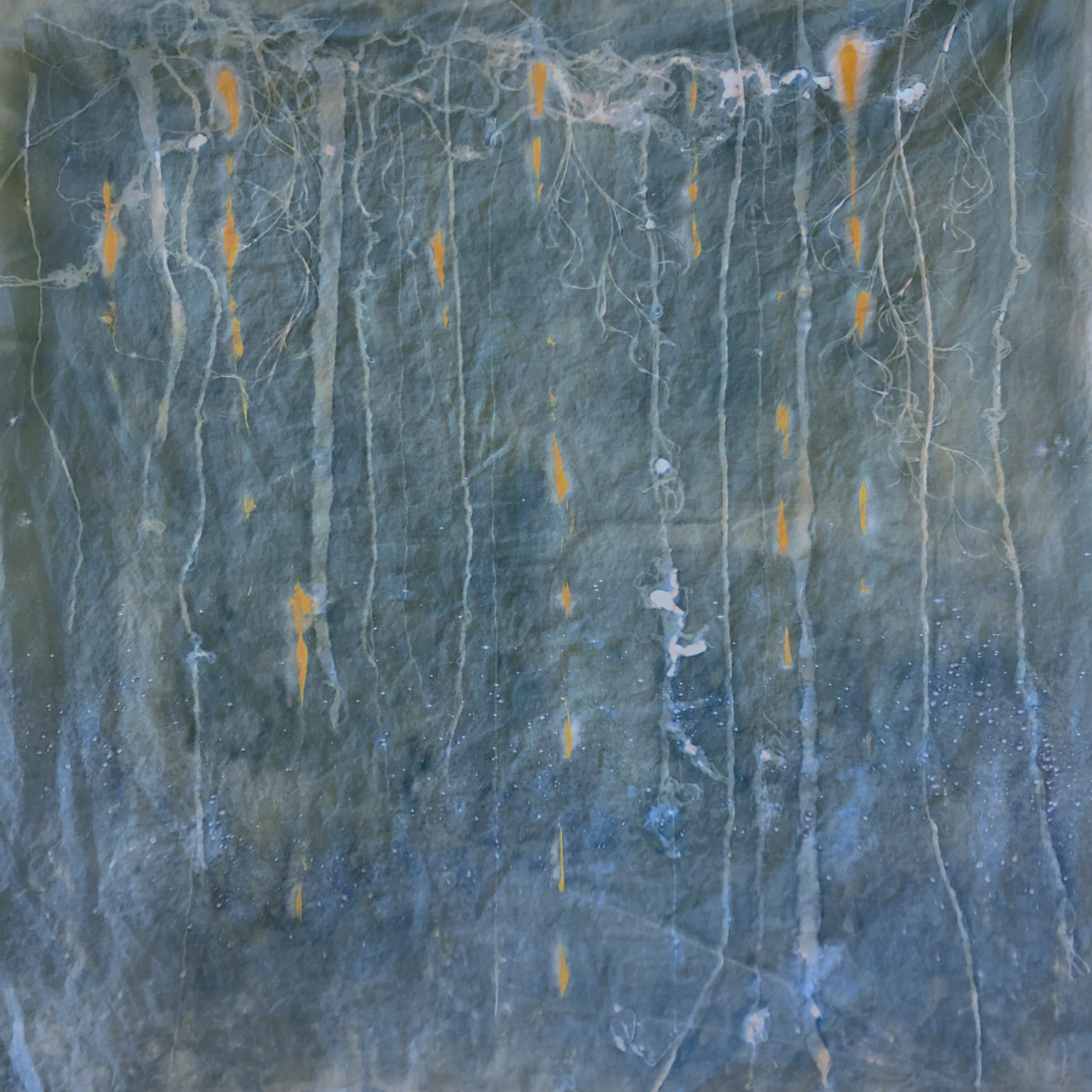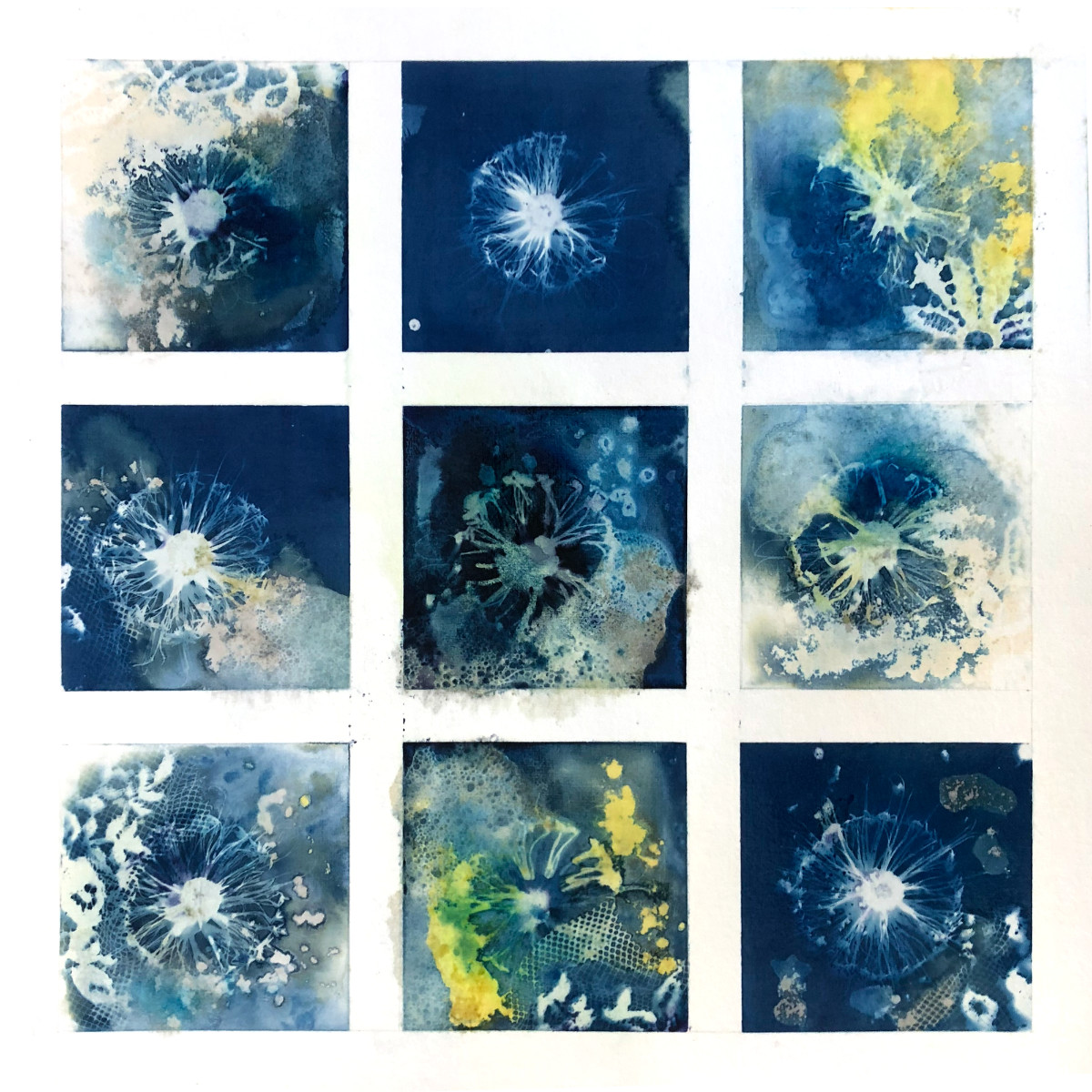 My primary medium is cyanotype, particularly utilising wet techniques, incorporating staining, toning, and unique chemical interactions to create painterly and water colour effects. I print on both fabric and paper.